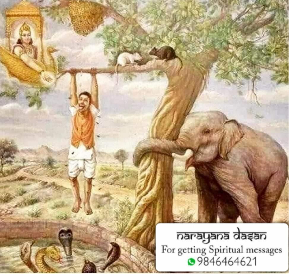 തൊട്ടടുത്ത് നമ്മെ രക്ഷിക്കാൻ കൈ നീട്ടി ഭഗവാൻ നിൽപ്പുണ്ട്… ഒരു കൈ കൊമ്പിലും പിടിച്ച് മറുകൈ ഭഗവാനും കൊടുത്ത് നിന്നാൽ (ഉപാസനാദികൾ ചെയ്ത് ജീവിച്ചാൽ ) മരകൊമ്പ് ഒടിഞ്ഞ് വീഴുമ്പൊ ( ആയുസ്സ് ഒടുങ്ങുമ്പൊ ) താഴെയുള്ള കിണറ്റിൽ വീഴാതെ (അടുത്ത ജന്മം) ഭഗവാൻ നമ്മെ രക്ഷിച്ചെടുക്കും…