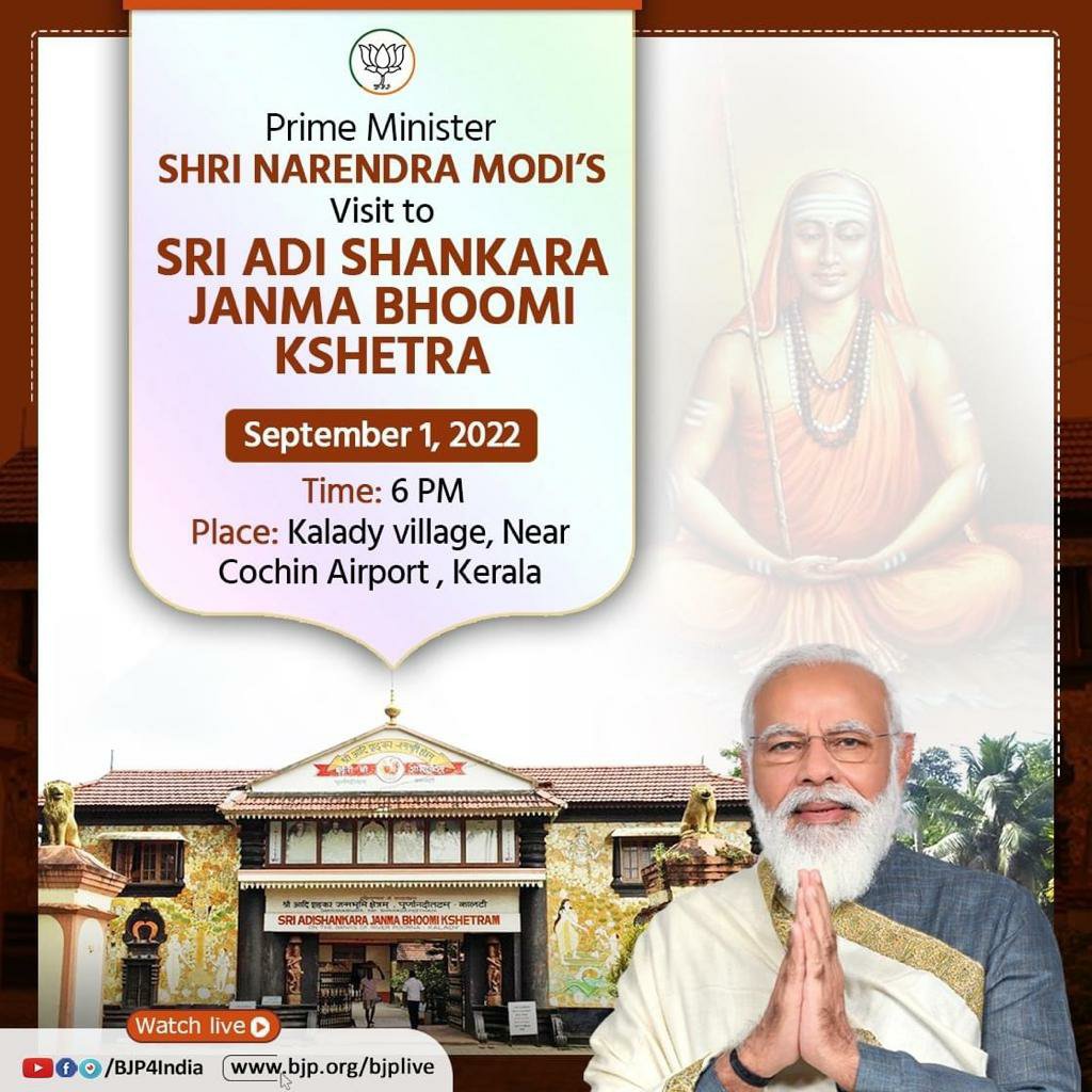 𝙿𝚛𝚒𝚖𝚎 𝙼𝚒𝚗𝚒𝚜𝚝𝚎𝚛 𝚂𝚛𝚒 Narendra Modi𝚓𝚒 𝚠𝚒𝚕𝚕 𝚟𝚒𝚜𝚒𝚝 𝚝𝚑𝚎 𝐀𝐝𝐢 𝐒𝐡𝐚𝐧𝐤𝐚𝐫𝐚 𝐉𝐚𝐧𝐦𝐚𝐛𝐡𝐨𝐨𝐦𝐢 𝐊𝐬𝐡𝐞𝐭𝐫𝐚𝐦, 𝚝𝚑𝚎 𝚑𝚘𝚕𝚢 𝚋𝚒𝚛𝚝𝚑𝚙𝚕𝚊𝚌𝚎 𝚘𝚏 𝙰𝚍𝚒 𝚂𝚑𝚊𝚗𝚔𝚊𝚛𝚊𝚌𝚑𝚊𝚛𝚢𝚊 𝚜𝚒𝚝𝚞𝚊𝚝𝚎𝚍 𝚘𝚗 𝚝𝚑𝚎 𝚋𝚊𝚗𝚔𝚜 𝚘𝚏 𝚛𝚒𝚟𝚎𝚛 𝙿𝚘𝚘𝚛𝚗𝚊 𝚊𝚝 𝙺𝚊𝚕𝚊𝚍𝚢 𝚟𝚒𝚕𝚕𝚊𝚐𝚎 𝚒𝚗 𝙺𝚎𝚛𝚊𝚕𝚊 𝚘𝚗 𝟶𝟷 𝚂𝚎𝚙 𝟸𝟶𝟸𝟸.